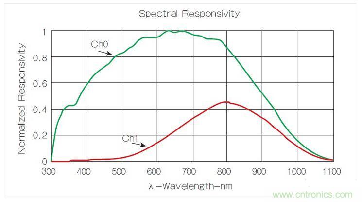 艾迈斯半导体已针对这个问题提出一个更好的解决方案:双二极管(dual-diode)???。其中一个光电二极管(如图2中所示的Channel 0)用来感测全光谱,另一个(图中的Channel 1)则主要用来感测光谱中的红外线部分。从全光谱传感器的输出中减掉红外线光电二极管的输出,则可得到可见光的测量结果。