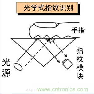 光学传感器的发展历史可能是最久的了,已经有30年的历史了。实现的原理也是最简单的。 它主要是利用光的折摄和反射原理,将手指放在光学镜片上,手指在内置光源照射下,光从底部射向三棱镜,并经棱镜射出,射出的光线在手指表面指纹凹凸不平的线纹上折射的角度及反射回去的光线明暗就会不一样。用棱镜将其投射在电荷耦合器件上CMOS或者CCD上,进而形成脊线(指纹图像中具有一定宽度和走向的纹线)呈黑色、谷线(纹线之间的凹陷部分)呈白色的数字化的、可被指纹设备算法处理的多灰度指纹图像。