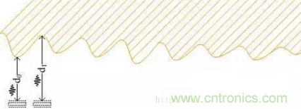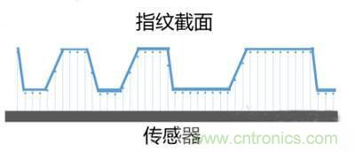 其原理是将电容感整合于一块芯片中,当指纹按压芯片表面时,内部电容感测器会根据指纹波峰与波谷而产生的电荷差,从而形成指纹影像。如下简图,可以把上面的凹凸认为是指纹的谷和脊,那么同传感器就会形成不同的电容差,这样传感器就可以根据这些不同的电容差画出指纹的纹理。