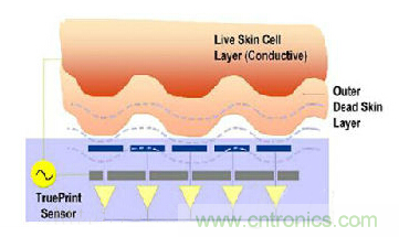 工作原理则不一样;其是利用手指按在芯片表面时,指纹的波峰波谷对芯片内部电容上下电极电荷分配的比例影响程度来对指纹进行重现指纹,无需额外增加驱动源,芯片结构非常单纯(如下图),也因为无额外驱动信号,所以模组也无需外置Ring,模组结构也非常简单。