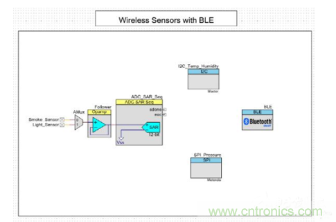 内置BLE功能的处理器的灵活性和丰富资源,使传感器能够与单一BLE设备连接。图2是使用PSoC Creator的典型配置。PSoC Creator是一个用于围绕PSoC架构开发应用程序的IDE。图中显示的是模拟和数字传感器接口以及BLE子系统。该配置展示的是用于感测烟雾、光照强度、温度、湿度和压力的典型工业数据监测系统。配置中的每个组件都有一个关联的应用程序编程接口(API),开发人员可根据需要访问这些组件。每个组件还有一个与其相关的数据表对组件的可用配置进行说明。