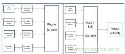 无线传感器网络通常作为网状网络和枢纽网络(见图1)。枢纽网络包括可以放置在相同位置的所有传感器。每个传感器需要连接到单个BLE外围设备(服务器)来处理数据并将其发送到BLE中央设备(客户端)。网状网络采用可以远程定位传感器的拓扑结构。网格中的每个节点都需要连接到BLE外围设备(服务器),所有这些外围设备都可以连接到BLE中央设备(客户端)。