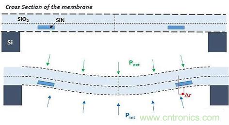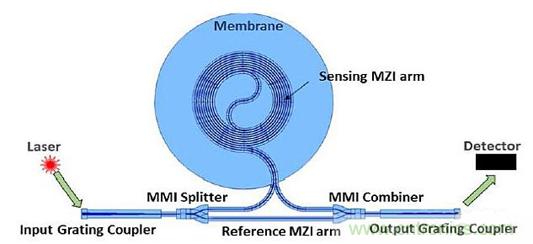 在制造该器件的过程中,创制了一个传感膜。当膜弯曲时,波导的位置发生变化,从而引起光路延伸,导致该特定臂发生相移(图2)。