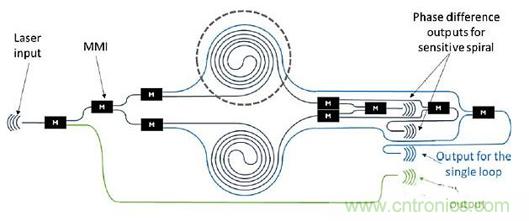 改进后的MOM压力传感器设计,MZI是平衡的;第一个是大范围测量用单回路,第二个将敏感螺旋臂中的信号分成两路去相位输出,这样就能始终对每一压力进行灵敏测量(图3)。