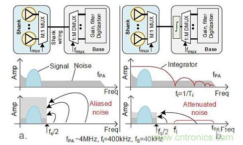图4:(a)显示了在没有滤波器的情况下,电路多路复用时发生的情况;(b)显示通过积分对信号进行滤波,降低了带外噪声电平。