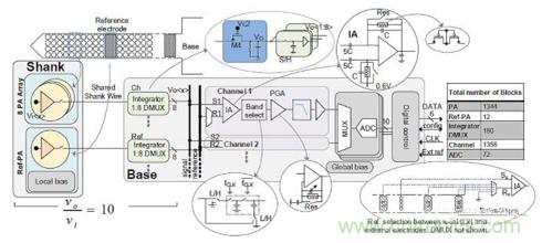 另外,目前的电子设计架构也不是最佳。探针设计由大量小型有源电极组成,用于放大和缓冲神经信号。CMOS像素放大器(PA)位于电极下方极小的空间内,由于空间不足,信号处理被迫在探针的底座完成。想象一下这种非理想信号路由中的噪声问题,理想情况下希望信号处理紧挨着PA进行。