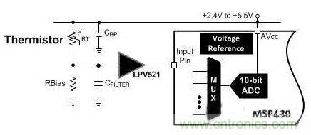 从技术上讲,热敏电阻是一种电阻器,它的电阻值随温度的变化而变化。如图1中所示,需要一个偏置电路和少数几个外部组件,在这里,偏置电阻器和热敏电阻组成了一个分压器,并且被接到一个可选运算放大器上,这个运算放大器与微控制器 (MCU) 的模数转换器 (ADC) 相连,从而将热敏电阻的电阻值转换为一个温度值。