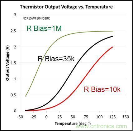 热敏电阻的缺点是,只有在很窄的温度范围内,它的输出才是线性和准确的,而在这个范围之外会变得非线性。图2绘制了三条热敏电阻的输出曲线,偏置电阻分别为1MΩ、35kΩ和10kΩ。在窄温度范围内,每条曲线都是线性的,不过在偏置电阻分别为1MΩ、35kΩ和10kΩ,而温度分别为10ºC、75ºC和50ºC以下时,这三条曲线为非线性。虽然针对特定温度,可以使用专门校准的热敏电阻来实现目标精度,但是这种热敏电阻成本较高,并且这三款不同的器件也使得库存管理变得过于复杂。其它缺点还包括无法预计的故障、抗扰度低和功耗较高。