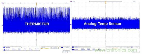 图6:热敏电阻与模拟温度传感器在连接到开关稳压器时的噪声实验