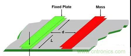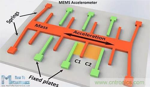 通用 MEMS 感应技术是使用片载可变电容器。在运动中,绿色的固定板保持静止,而橙色的重物沿加速度轴弯曲。通过这种运动,电容值 C1 和 C2 会随着固定板与重物之间距离的变化而变化。