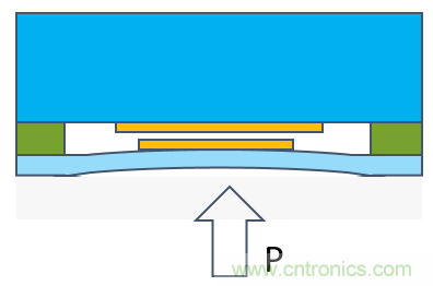 典型陶瓷电容压力传感器芯体为密封表压结构,由陶瓷基座和可变形膜片及中空密封腔体三部分组成,承压面为可变形膜片,当芯体承压发生变化时,变形膜承压后发生弯曲,导致基板间距发生变化,引起极板间电容的变化,电容变化通过调理芯片转换为标准输出(如0~5V电压输出、4~20mA电流输出、I2C、SPI数字输出等)。