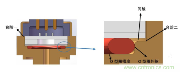 通过控制上图中台阶一与O型圈槽底的高度差,对O型圈压缩量进行控制。