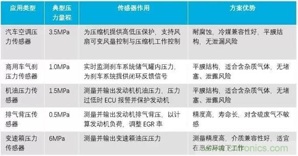 汽车领域陶瓷电容压力传感器典型应用如下表所示: