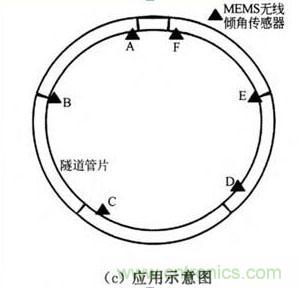 无线倾角传感器采用电池供电,将MEMS无线倾角传感器安装在盾构隧道内衬砌圆环的管片上,包括封顶块、邻接块、标准块、封底块和块与块间以环向螺连接构成的纵向接头等不同部位;实时测量隧道管片内各部位的倾斜角度,通过组合计算得出管片的实际形变,实现对隧道结构变化准确、有效地实时监测,应用示意如图(c)所示。