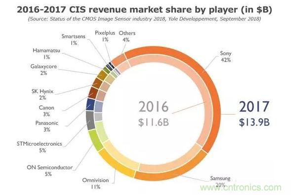 据麦姆斯咨询介绍,CMOS图像传感器(CIS)已成为半导体产业的关键器件。这不仅是因为所涉及的技术及其带来的市场营收,而是因为现在已经无法想象智能手机、汽车甚至是房屋如果没有摄像头的支持会怎样。根据Yole最新发布的《CMOS图像传感器产业现状-2018版》报告,2017年CIS产业的市场规模达到了139亿美元,预计未来5年的复合年增长率(CAGR)将达到9.4%。