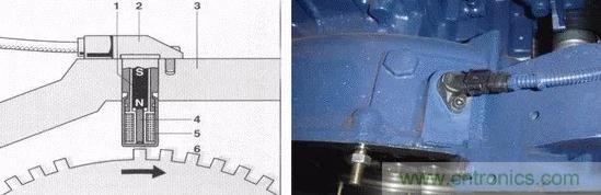 1、永磁铁 2、传感器壳体 3、发动机外盖 4、软铁芯 5、线圈 6、传感线圈