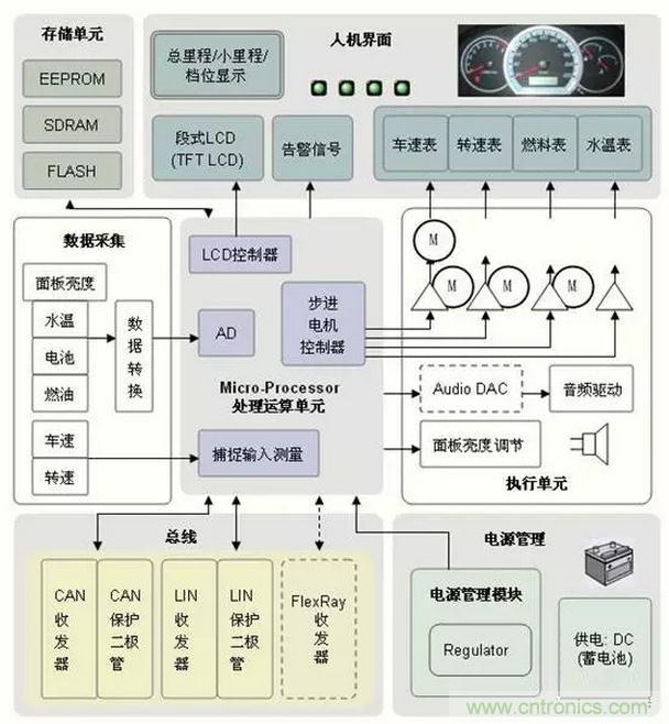 在汽车仪表系统中,各种仪表的传感器的作用是将发动机温度、机油压力、发动机转速、变速器输出轴转速、燃油箱油面的高低等物理参量转换为相应的电压、电流或电脉冲。并驱动相应的仪表动作,显示相应的被测量参量。当测量值达到预设的极限值时就会使指示灯报警。