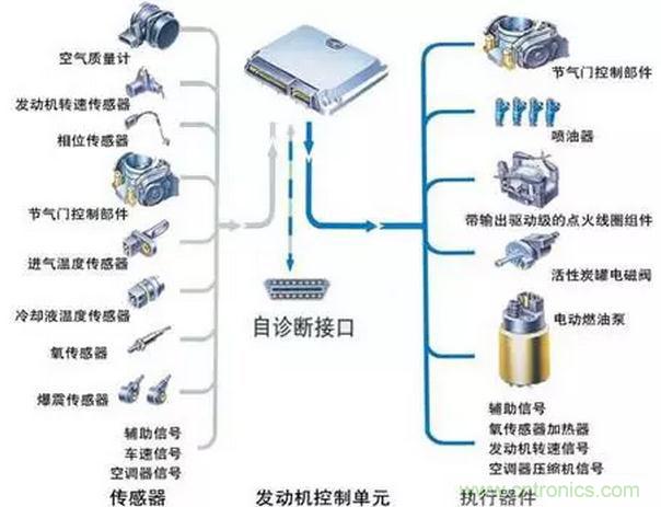 汽车电子控制系统有传感器、电子控制器(ECU)和执行器的组成。在汽车电子控制系统中,传感器的作用是将被控对象的相关参量转换为相应的电信号,并输送给控制器,控制器根据相关传感器的信号对被控对象的工况及状态进行分析与判断后,输出控制信号,通过执行器实现自动控制。电子控制系统分为发动机电子控制系统、底盘电子控制系统和车身电子控制系统。