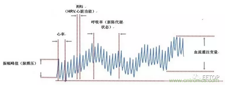 光学心率传感器可生成测量心率的PPG波形并将该心率数据作为基础生物计量值,但是利用PPG波形可以测量的对象远不止于此。尽管很难取得和维护精确的PPG测量结果(我们将在下一篇详细论述它),但是如果您能够成功获得精确的PPG测量结果,它将发挥强大的作用。高品质PPG信号是当今市场需求的大量生物计量的基础。图2是经过简化的PPG信号,该信号代表了多个生物计量的测量结果。