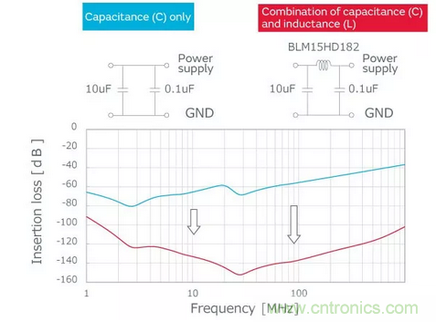 仅使用电容器的情况下,需要低频端的大容量电容器和为获得高频端插入损耗的低ESL电容器。