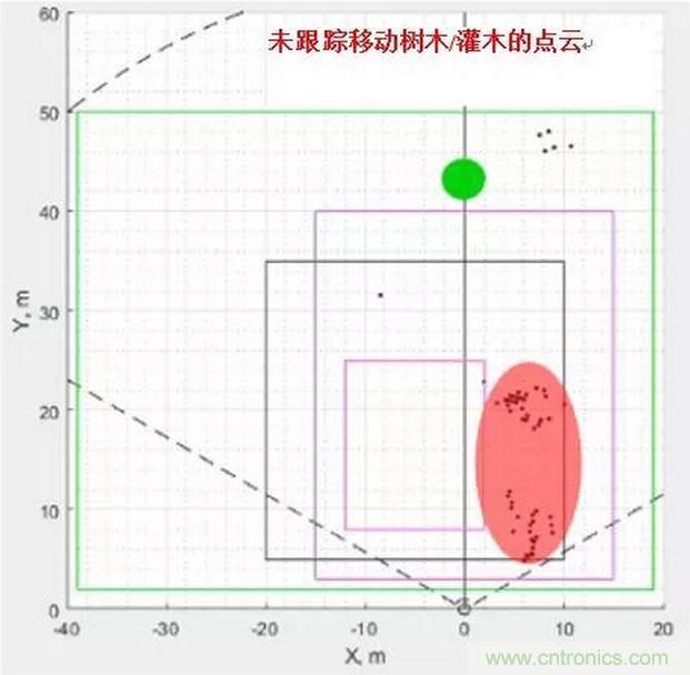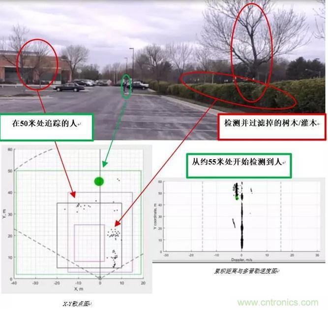 图2显示了使用毫米波技术的入侵检测;毫米波传感器分析场景中对象的速度,过滤掉移动背景中的运动,仅跟踪人物。