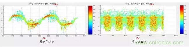 图3:两张图显示了行走的人和摆头风扇随时间推移的微多普勒信息
