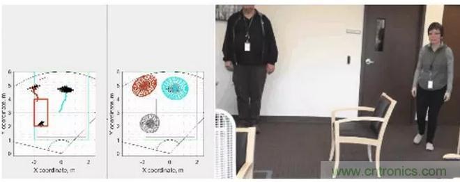 图4:使用毫米波传感器执行分类的示例:中间图上所有移动目标都分配了一个轨道,彩色区域表示人