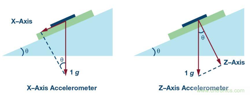 如下图,坡度角θ。下图左边,检测轴X轴垂直于重力平面(坡度为0时),此时加速度传感器的输出Ax=sin(θ)*1g。下图右边,检测轴Z轴平行于重力平面(坡度为0时),此时加速度传感器的输出Az=cos(θ)*1g。