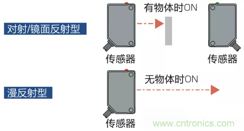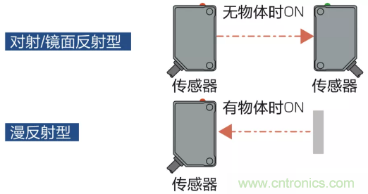 对射型/镜反射型传感器无物体时为ON;漫反射型传感器有物体时为ON