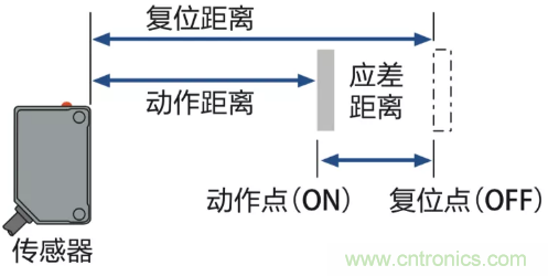 检测物从远到近靠近传感器直到输出变为ON的位置为动作距离,从此位置往外移动直到输出变为OFF的位置为复位距离。应差距离=复位距离-动作距离