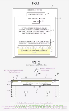 苹果公司希望通过此专利推进其在可调节光学层上的技术发展。此发明支持使用者对智能眼镜的光学层进行模式调节,例如按照个人喜好调整光学层的明暗。下图1是具有光学组件和电可调光学层的电子设备示意图;下图2是头戴式设备采用电可调光学层(#8)的示意图。
