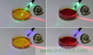 图2:实验演示图四宫格:在一组实验中,培养皿中装有酚红溶液,酚红溶液的颜色根据酸度变化(深黄色表示pH值小;红色表示pH值较大)。根据它的颜色变化,可以判断液体吸收的绿光和蓝光孰多孰少。吸收光后液体的温度变化,可以通过光纤探头来测量,由于可以判断确切的液体颜色,从而可以评估pH值。