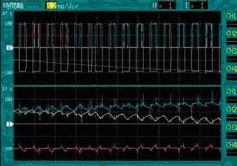 此外,3390还具备以X-Y图表显示来确认变频器的动态特性的功能,变频器不可或缺的谐波测量功能,用FFT评估影响变频器的干扰的功能(可达100kHz)等(图2)。而且,利用3390的500k采样/秒的高速采样率,来显示电压/电流波形(图3)。之前,需要使用数字示波器和差分探头、钳式电流传感器来观测波形,非常麻烦,现在1台3390即可实现。