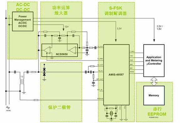 AMIS-49587符合IEC61334-5-1标准,为客户提供众多应用优势。例如,这器件基于ARM7TDMI处理器内核,同时包含物理接口收发器 (PHY)和媒体访问控制器(MAC)层,使其以单芯片方案结合了模拟调制解调器前端和数字后处理功能,而大多数竞争方案需要复杂的嵌入式软件来执行与 AMIS-49587相同的功能。设计人员使用AMIS-49587调制解调器,可以简化设计,能在不到一个季度的时间内开发出全套互操作PLC方案,还 降低开发及应用成本。实际上,基于AMIS-49587的调制解调器方案中仅使用2颗IC(另一颗为NCS5650 2 A PLC线路驱动器),外加16颗电阻、17颗电容、2个二极管、1个晶体和1个脉冲变压器,总元件数量仅为39个,提供低物料单(BOM)成本。