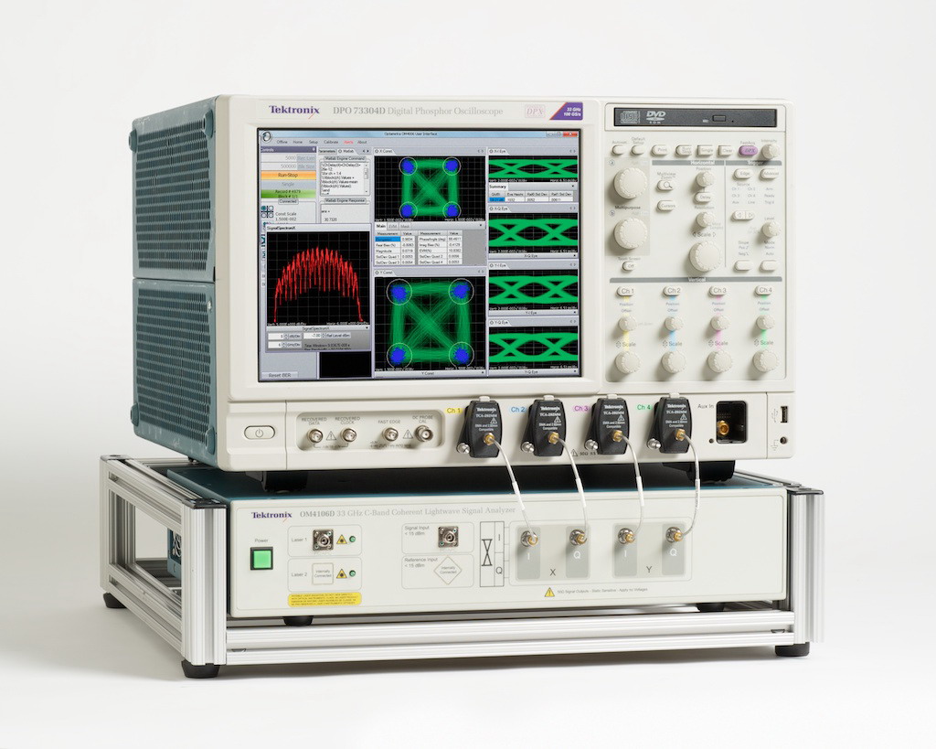 传统上,光调制分析仪可与许多种示波器机型搭配使用。OM4106D是第一个与高速示波器紧密整合的光调制分析仪,这让它的性能可以测试市场上速度最快的相干光波系统。DPO73304D示波器提供33GHz实时带宽,双通道采样率为100 GS/s,四通道采样率为50 GS/s。该示波器还有一个新 DataStore 公共接口,为分析任务提供2倍的从数字转换器到实现OM4106D算法的 MATLAB 应用的数据吞吐率。