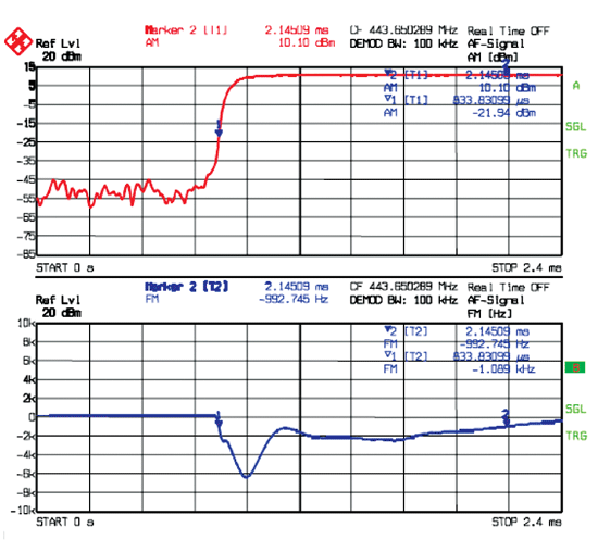 对于发射机和频综源来说,它们的幅度、频率和相位瞬态特性是重要的测试指标。一般来说,频率稳定时间是指发射机在输出电平达到一定数值(通常为稳定输出功率-30dB)开始,监测FM解调频谱,直到频率稳定到设计限值之内的这一段时间。
