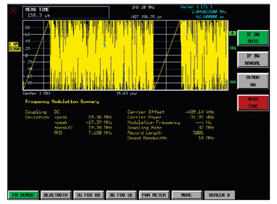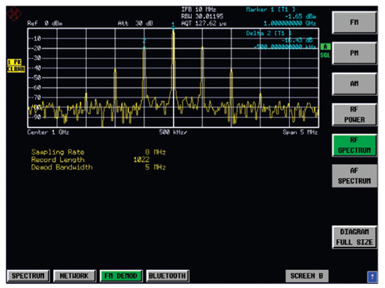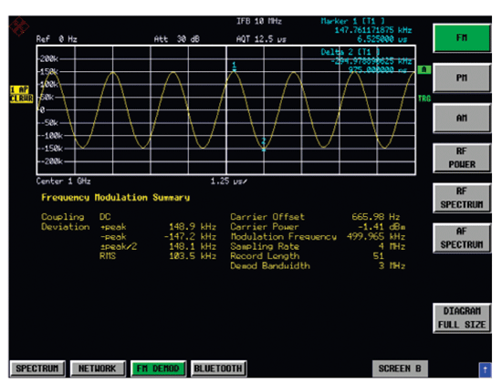 图6是罗德与施瓦茨公司频谱仪选件FS-K7在分析调频信号的应用。它采用上述解调原理,可以实时解调调频、调幅、调相和实时频谱。