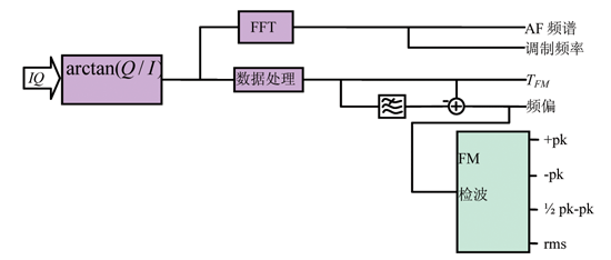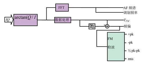 其中,Fm为输入信号的频率。对相邻点相位差值对时间求导,得出频率值。在测量时间内的所有Fm数值构成IQ幅度数组Fm-DC。