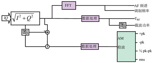 对此数组进行窄带低通滤波,获得载波幅度数组Vc ,计算AM-DC与Vc的差分数组,它与Vc的比值AMdeep 数组表述调制深度,对其进行检波:正峰值 (+pk):数组中的最大值;负峰值 (+pk):数组中的最小值;峰-峰值/2 (1/2pk-pk):数组中的最大值与最小值差值的一半;均方根值 (rms):数组中数值的均方根值。