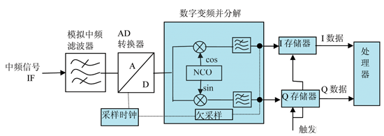 输入频谱仪的射频信号经过混频后变为中频信号IF,再经过带通滤波器(中频滤波器)进入A/D转换器。在数字处理部分,对下变频为基带的IQ信号进行低通滤波和欠采样,存储在内存中,准备进一步处理,存储的数据表述IQ信号的电压值。