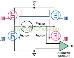 在使用单一控制FET的电磁阀控制(图1)中,电流始终沿同一方向流动,因此单向电流检测器就足够了。在电机控制配置(图2与图3)中,电机相位进行分流意味着取样电阻中的电流沿着两个方向流动,因此,需要双向电流检测器。